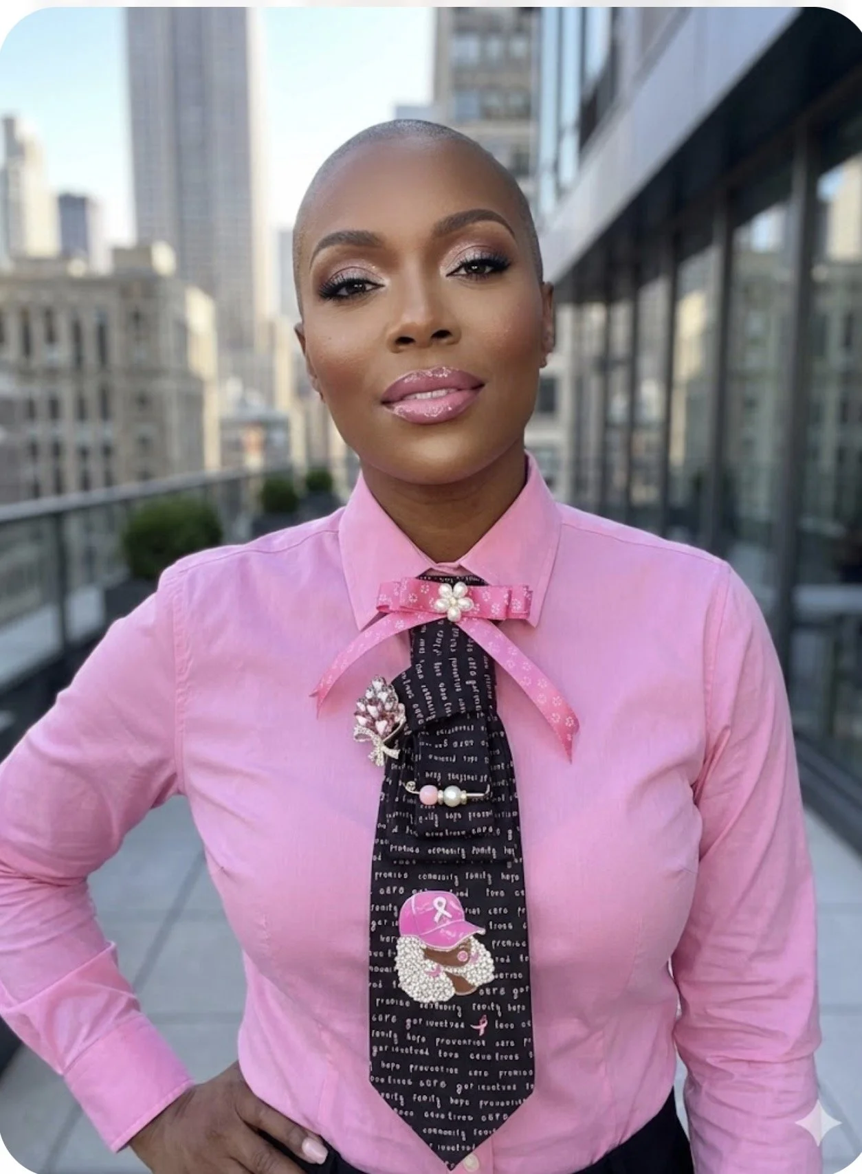 The Centerpiece: A striking, glittering emblem featuring a woman with a dazzling silver rhinestone afro wearing a pink awareness ribbon cap, perfectly capturing the beauty, style, and fierce spirit of survivors.