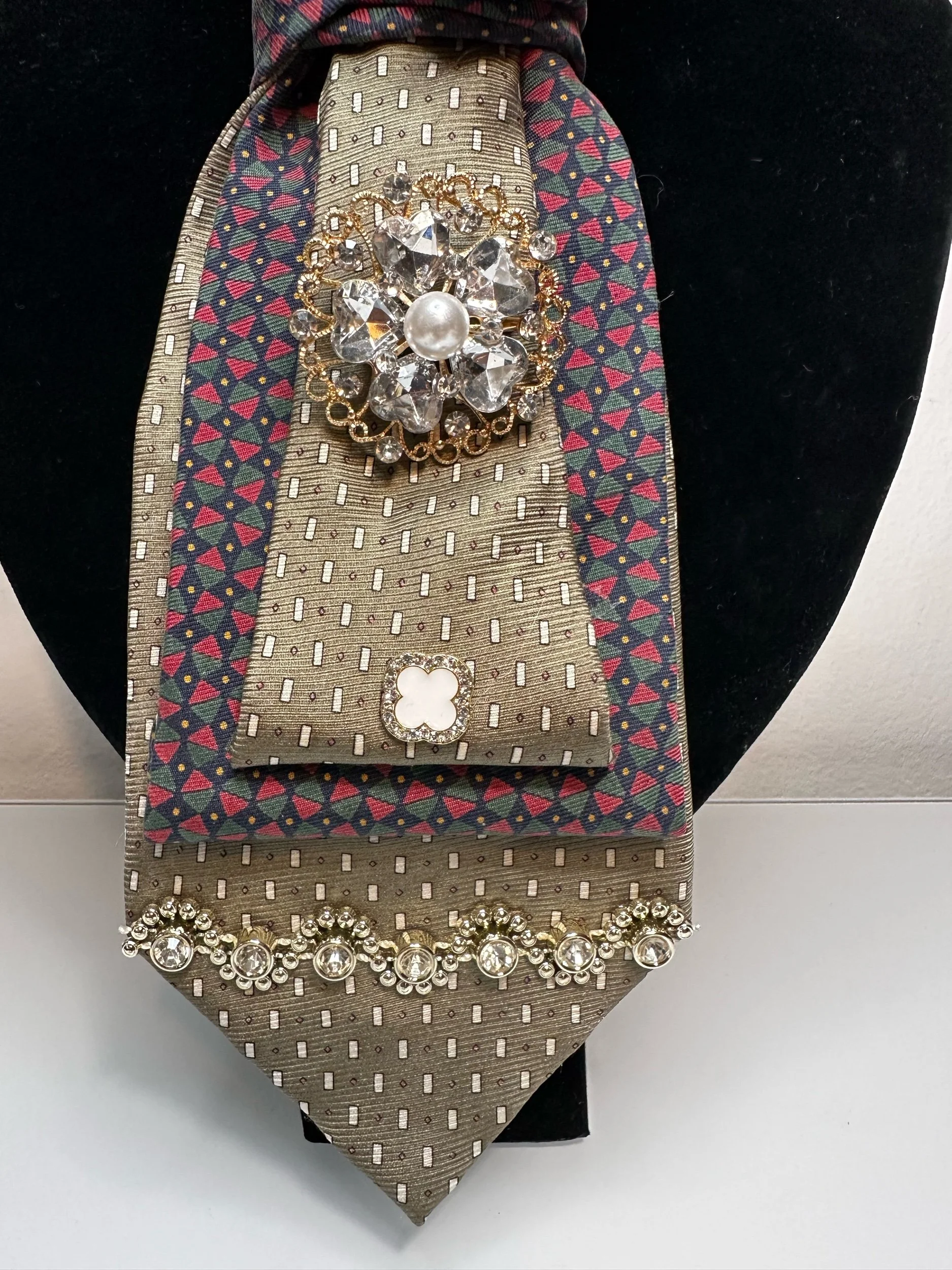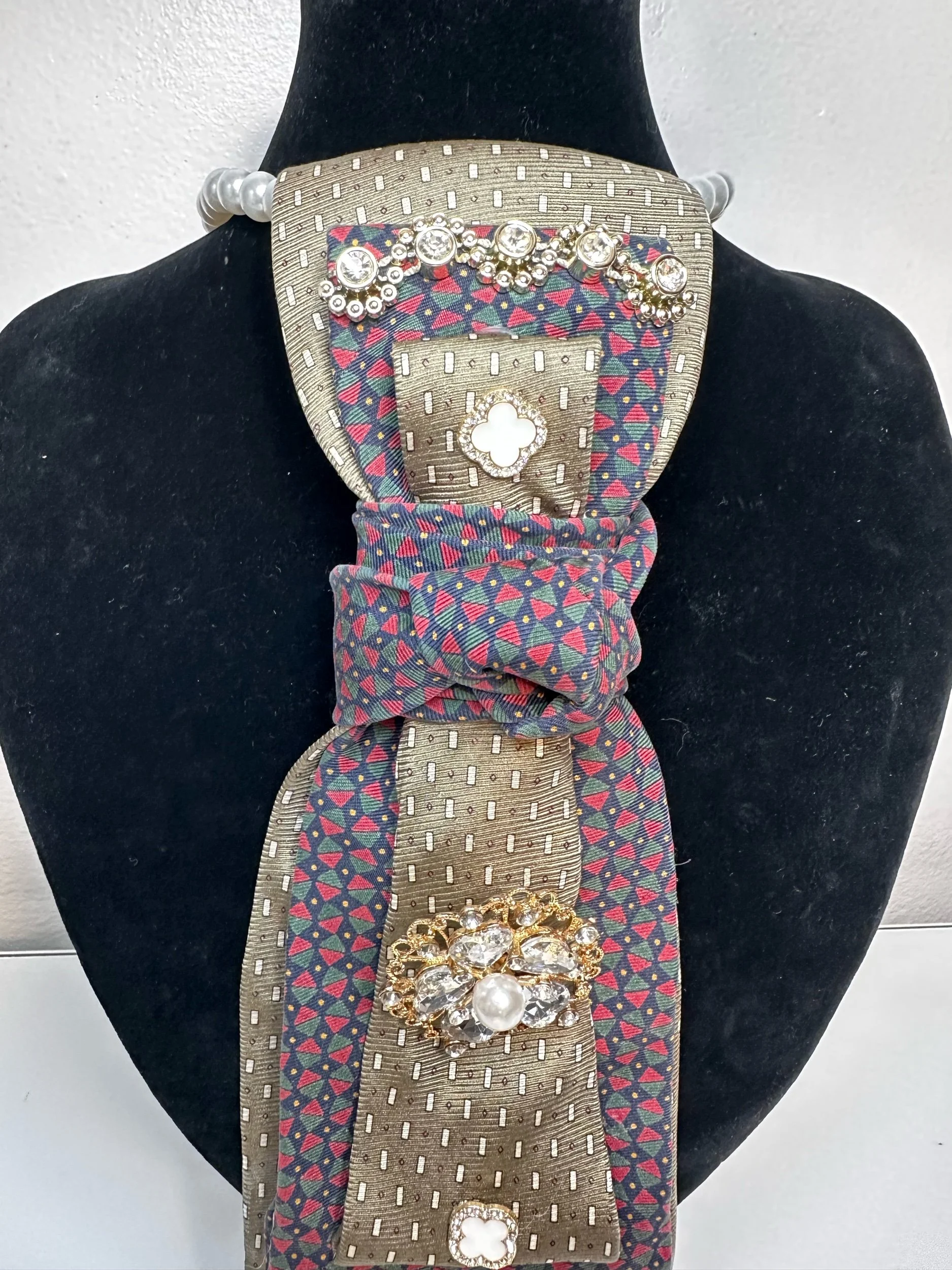 Welcome to our Cravette Collection - a men’s tie, creatively hand-folded & knotted into a women’s statement neckpiece, finished with a stunning jeweled brooch.