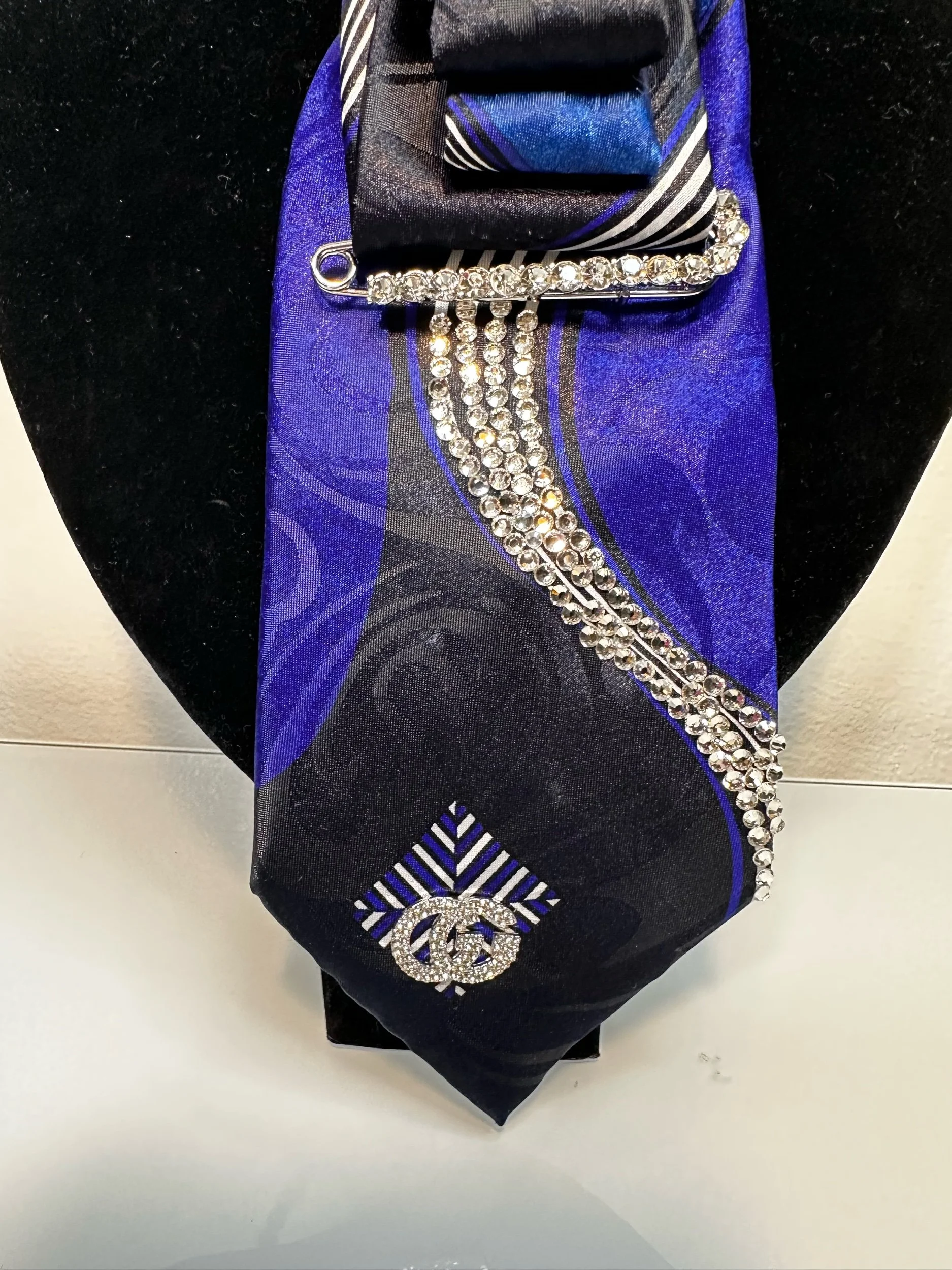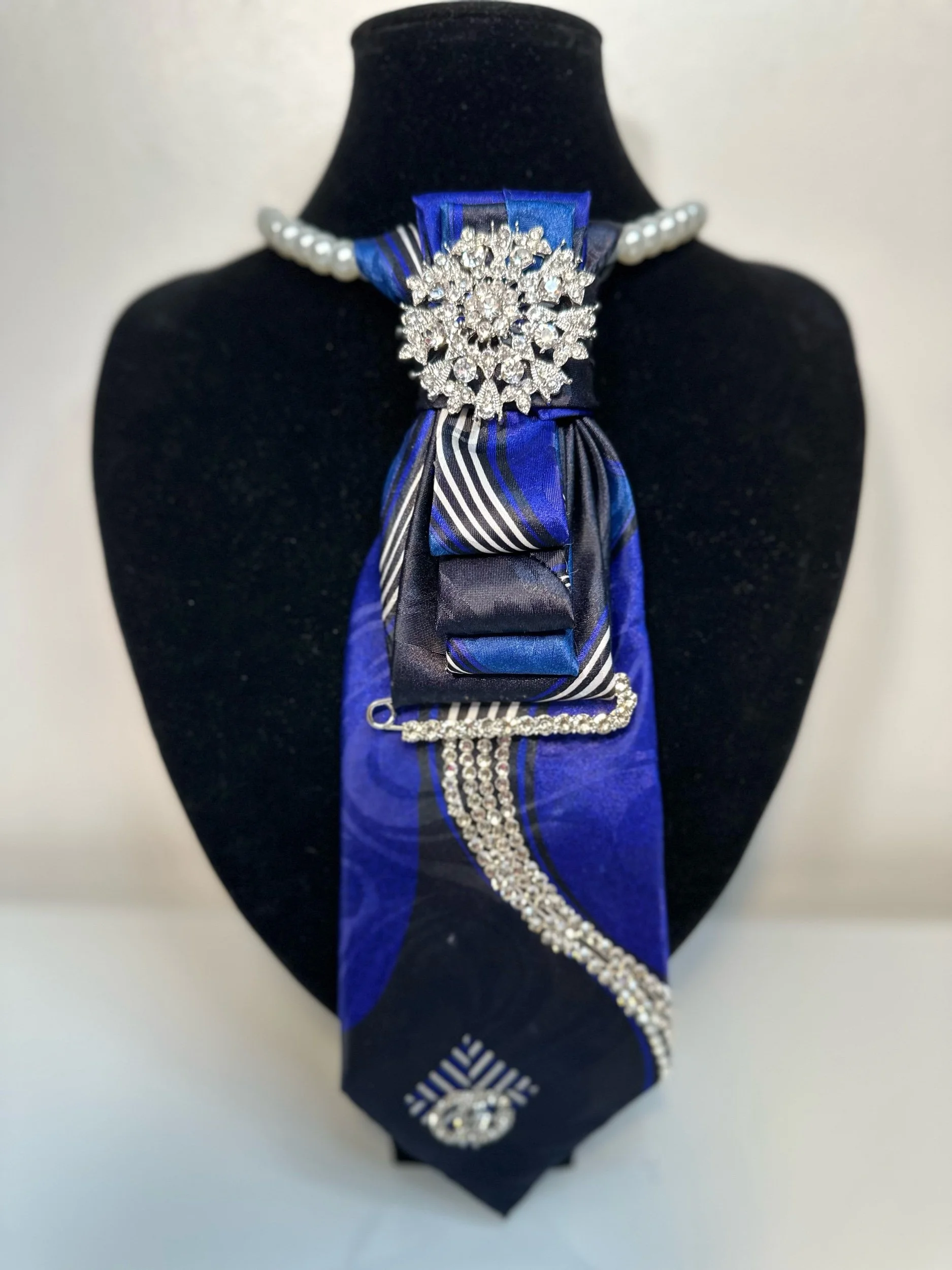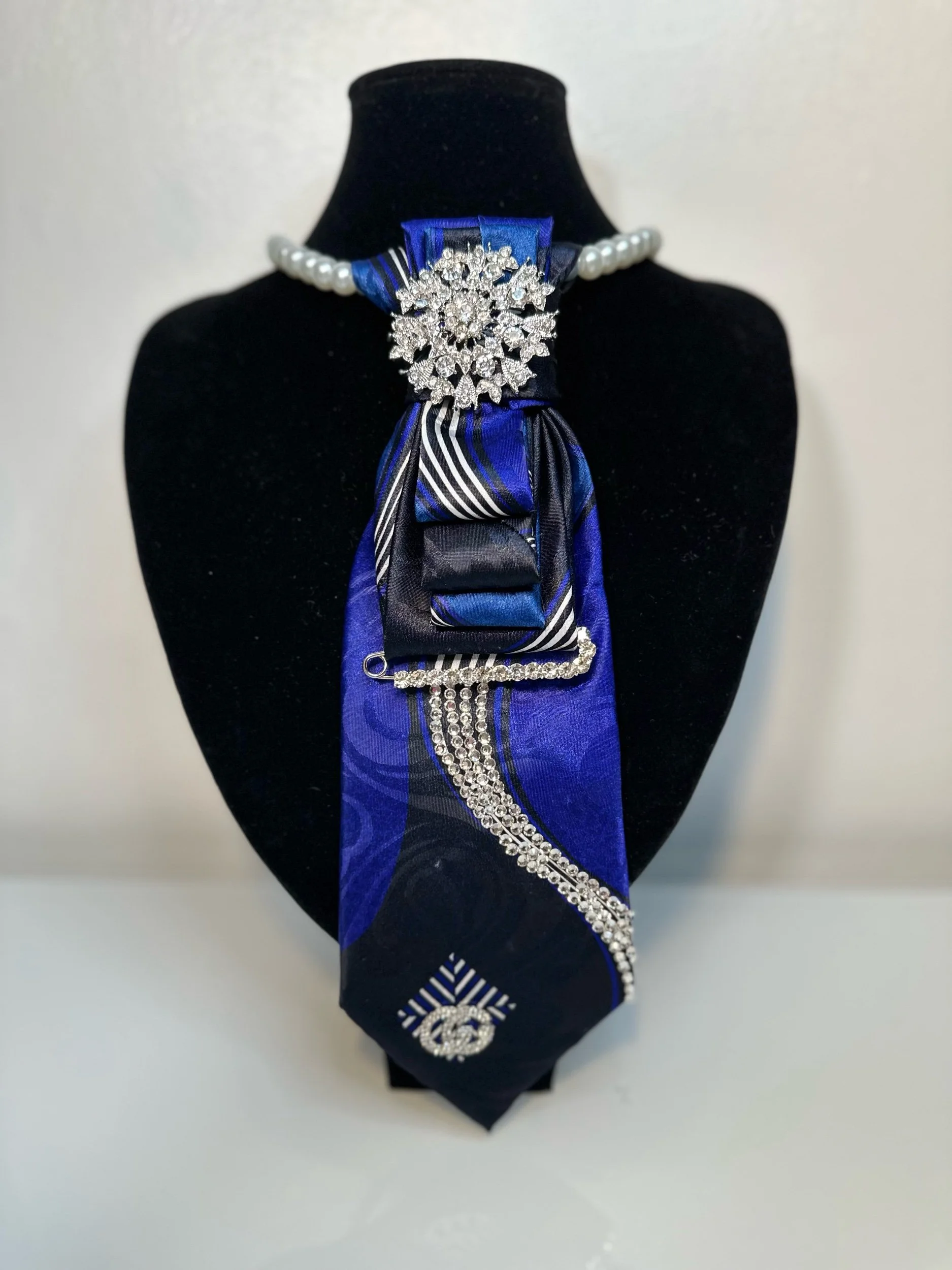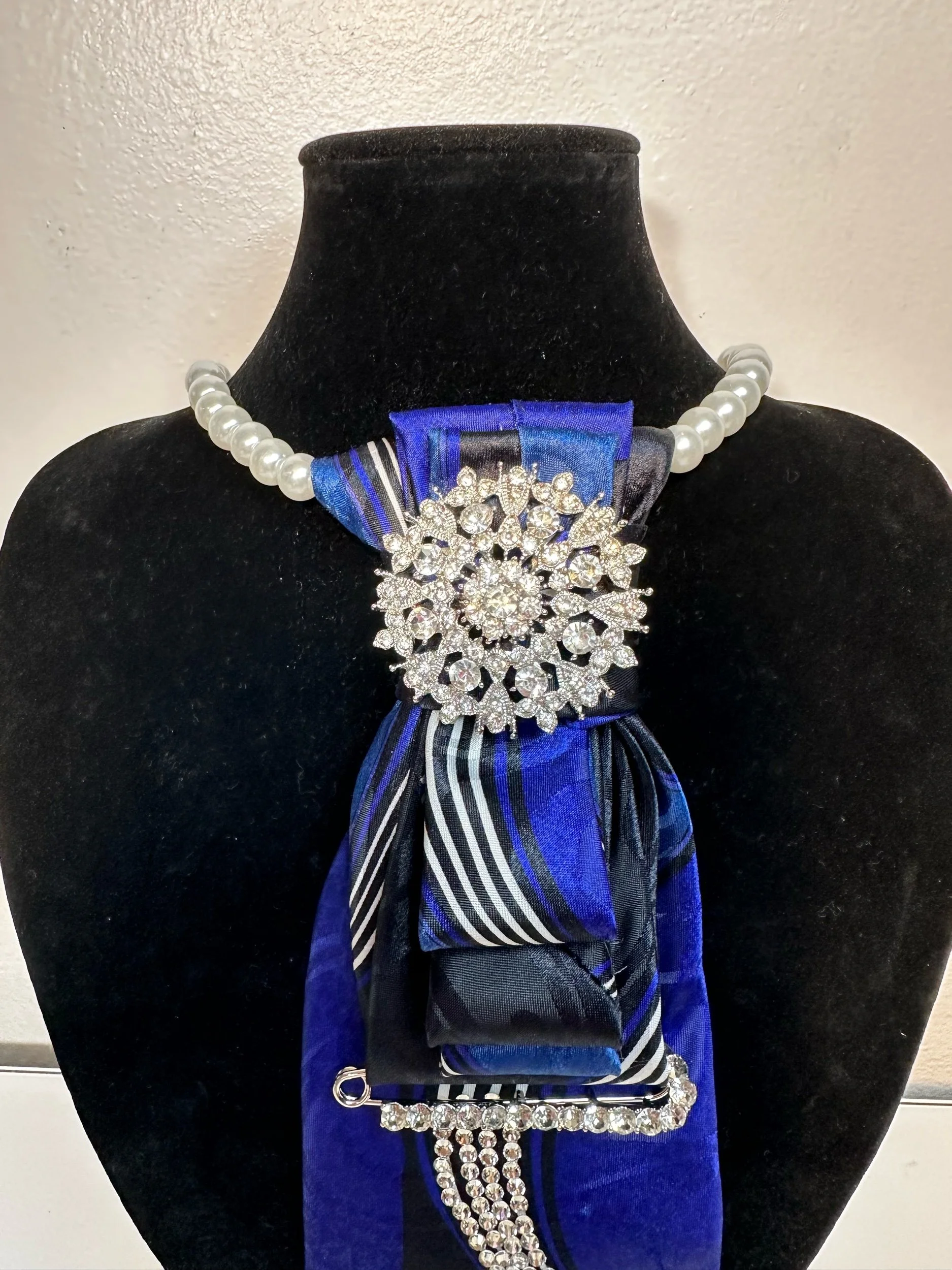 Welcome to our Cravette Collection - a men’s tie, creatively hand-folded & knotted into a women’s statement neckpiece, finished with a stunning jeweled brooch.