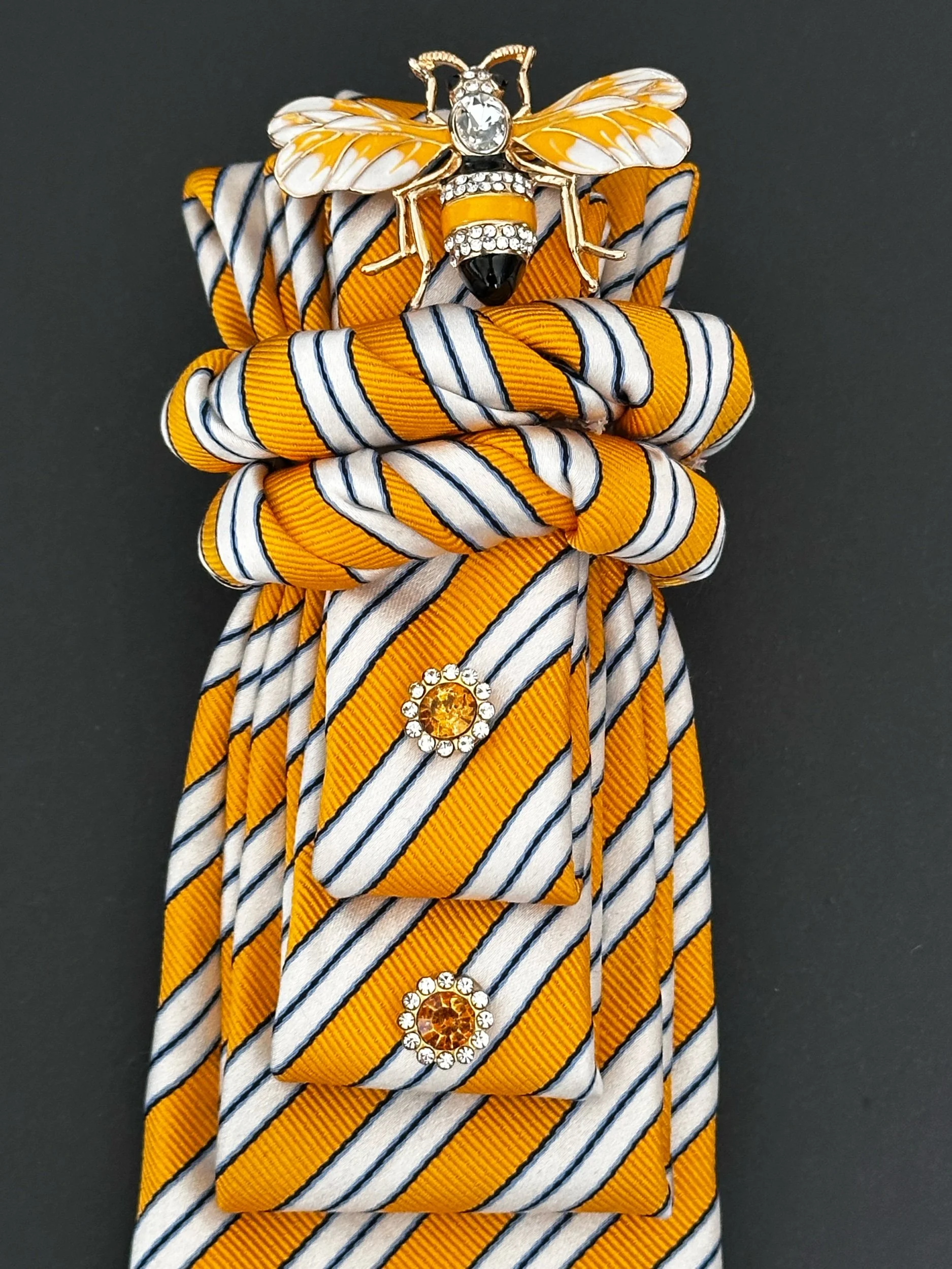 Welcome to our Cravatte Collection - a men’s tie, creatively hand-folded & knotted into a women’s statement neckpiece, finished with a stunning jeweled brooch.